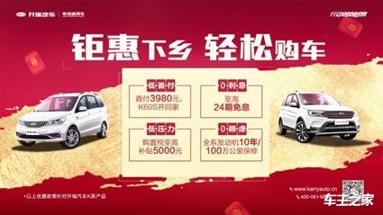 眼下,轰轰烈烈的“汽车下乡2.0”席卷全国,开瑞汽车趁势而为,在全国各地推出“开瑞汽车惠民下乡直补”活动。凡在活动期间内,符合规定购买19款开瑞K50/K60S产品,可享至高5000元购置税补贴;金融购车至高享贴息5000元;其中,19款开瑞K60S仅需首付3980元即可贷回家,老客户转介绍成交还有惊喜好礼。同时,全系发动机10年/100万公里超长质保,让消费者买的放心,用得安心。